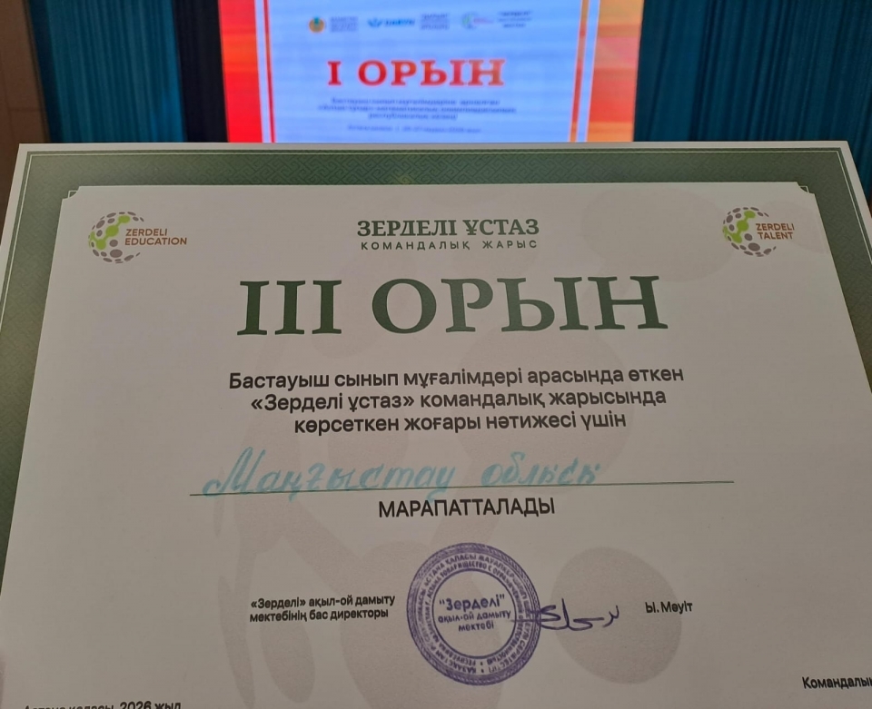 Командалық сайыста «Зерделі ұстаз» командалық есептер сайысында көрсеткен жоғары нәтижесі үшін Маңғыстау облысы ІІІ орын иеленді.