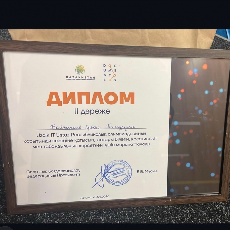2026 жылдың 27–29 сәуір күндері аралығында Астана қаласында информатика пәні мұғалімдерінің олимпиадалық тапсырмалар бойынша білімін тереңдету және кәсіптік бағдар беру бағытындағы қызығушылығын арттыру мақсатында өткен «Uzdik IT Ustaz» республикалық олимпиадасында Маңғыстау облысының педагогтері жүлделі орындарға ие болды.