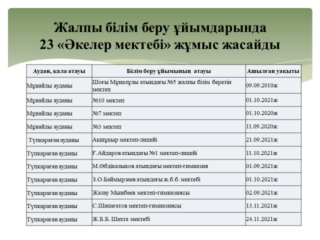 Отбасылық құндылықтарды сақтау, әкелердің бала тәрбиелеудегі жауапкершілігін арттыру, ата-аналардың жасөспірімдер арасында құқық бұзушылықтың алдын алу шараларын ұйымдастырудағы рөлін арттыру, балалардың патриоттық сезімдерін арттыру және ұлттық құндылықтарды насихаттау мақсатында облыстағы 35 білім беру ұйымдарында (23 ЖББҰ, 12 ТжКББҰ) «Әкелер мектебі» жобасы іске асырылуда.